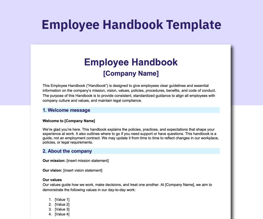 An employee handbook template gives you a practical starting point for building an employee handbook without creating every section from scratch. It helps you organize policies, expectations, benefits, and workplace guidance in one place, while still leaving room to tailor the final document to your company, workforce, and legal context.