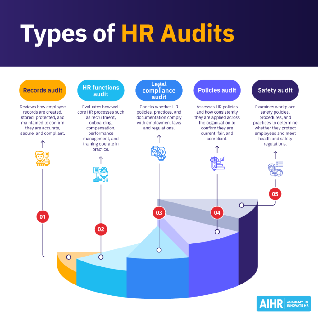 - Different types of HR audits focus on different areas, including records, HR functions, legal compliance, policies, and workplace safety.