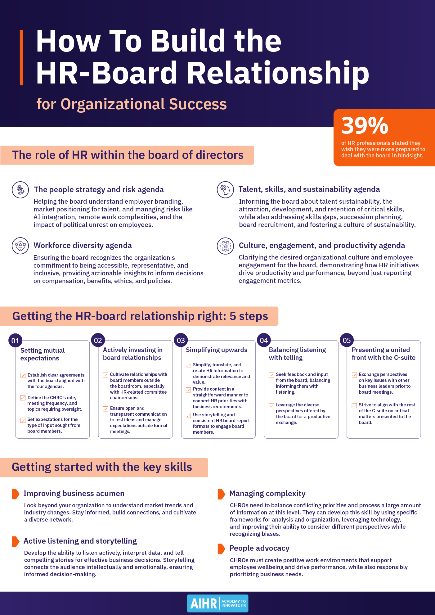 Building strong HR-board relationships is essential for CHROs to effectively influence key areas such as governance, executive pay, diversity, and succession planning. What’s more, successfully navigating board interactions can establish the legitimacy and credibility necessary to drive the strategic HR agenda.