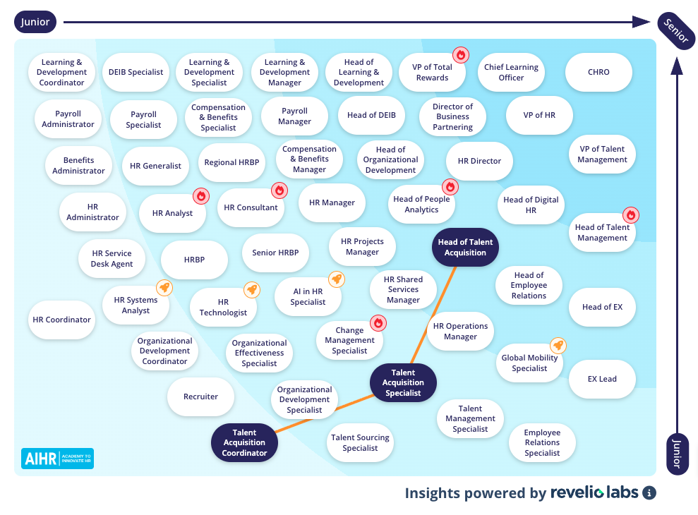 AIHR’s HR Career Map provides a clear path for professionals who begin in coordination roles, where they learn the fundamentals of hiring operations and gradually progress toward influencing talent strategy. This usually results in them leading teams and shaping how organizations attract and hire people.
