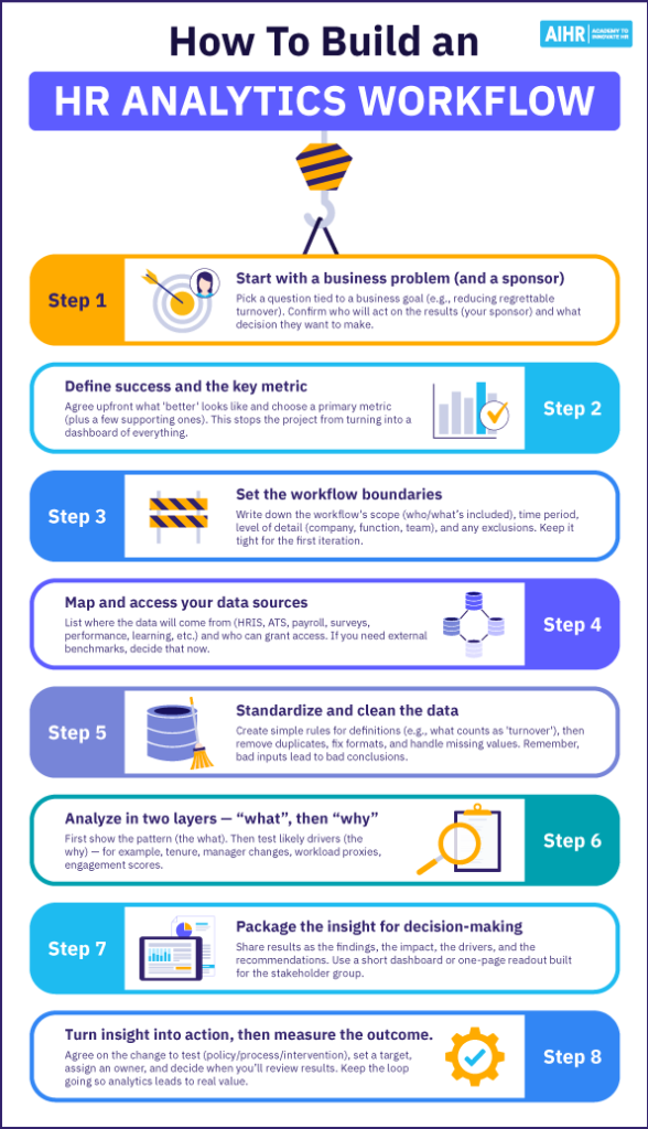 - Step 4: Map and access your data sources. List where the data will come from (HRIS, ATS, payroll, surveys, performance, learning, etc.) and who can grant access. If you need external benchmarks, decide that now.