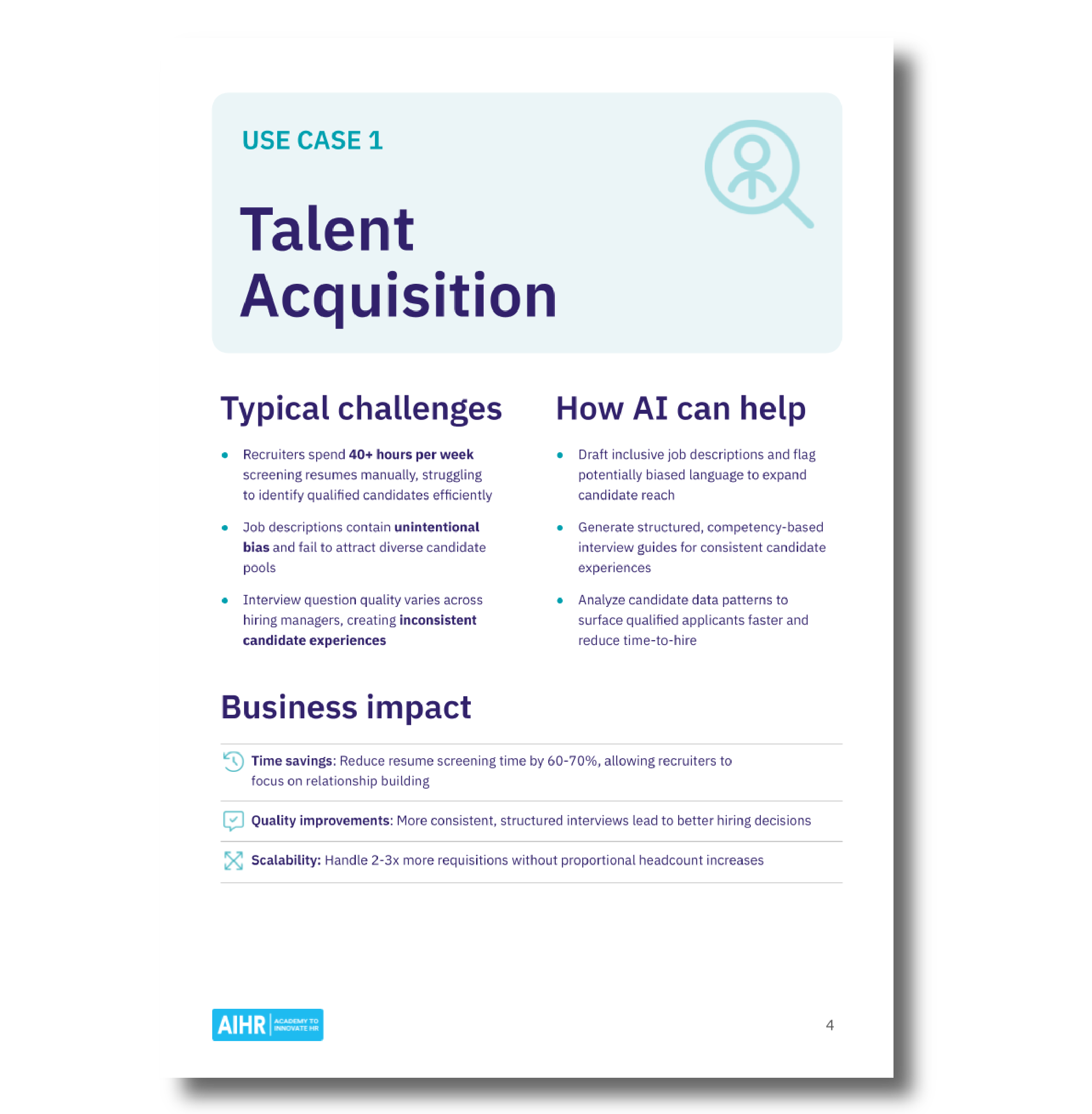 If you’re in the same boat, this guide gives you a clear picture of what your peers are actually doing with AI across nine HR use cases, why it’s working, and how to figure out which opportunities are worth pursuing in your organization.