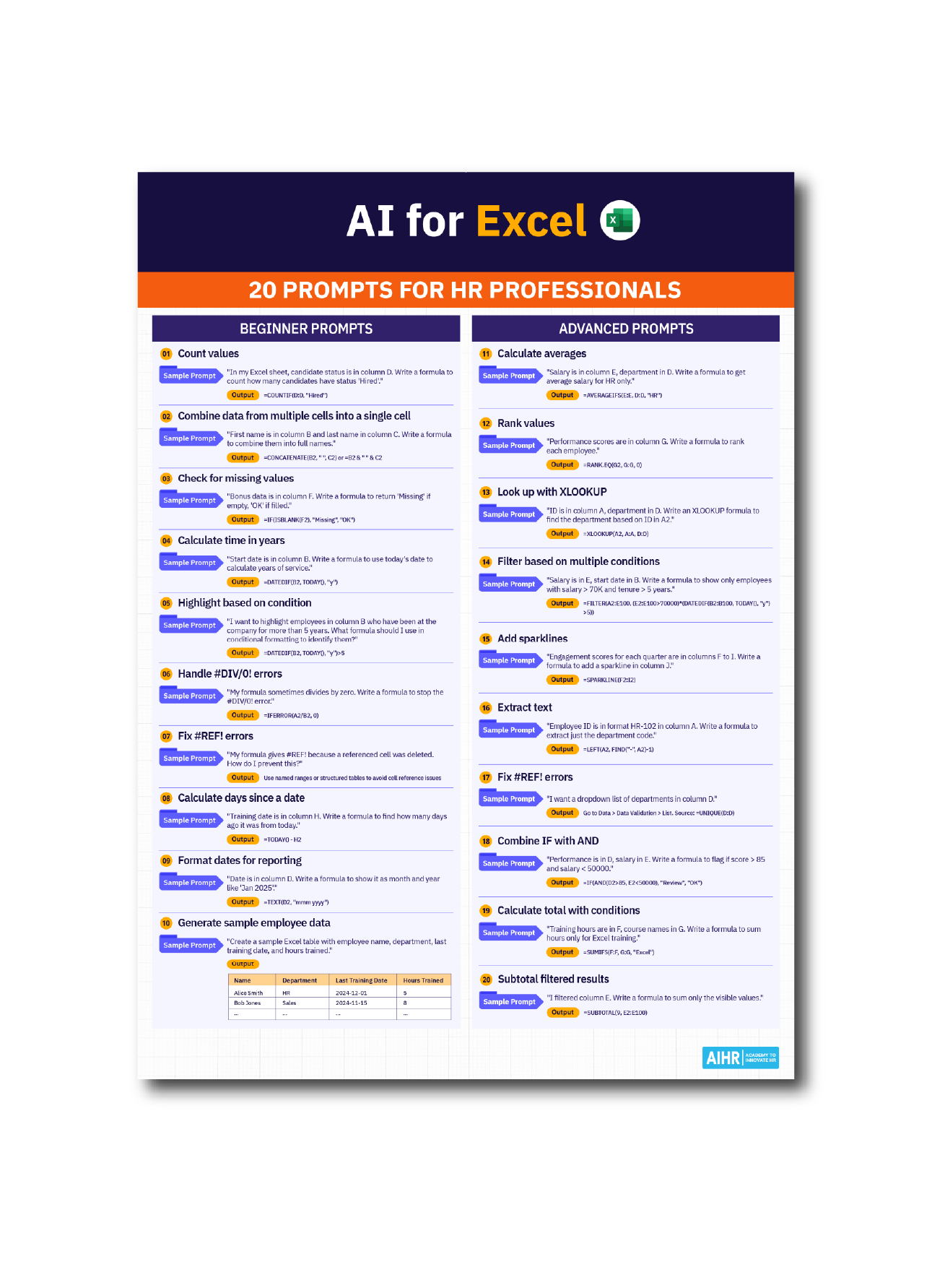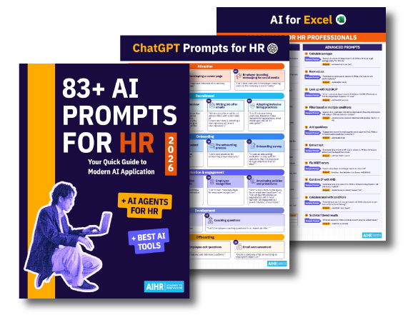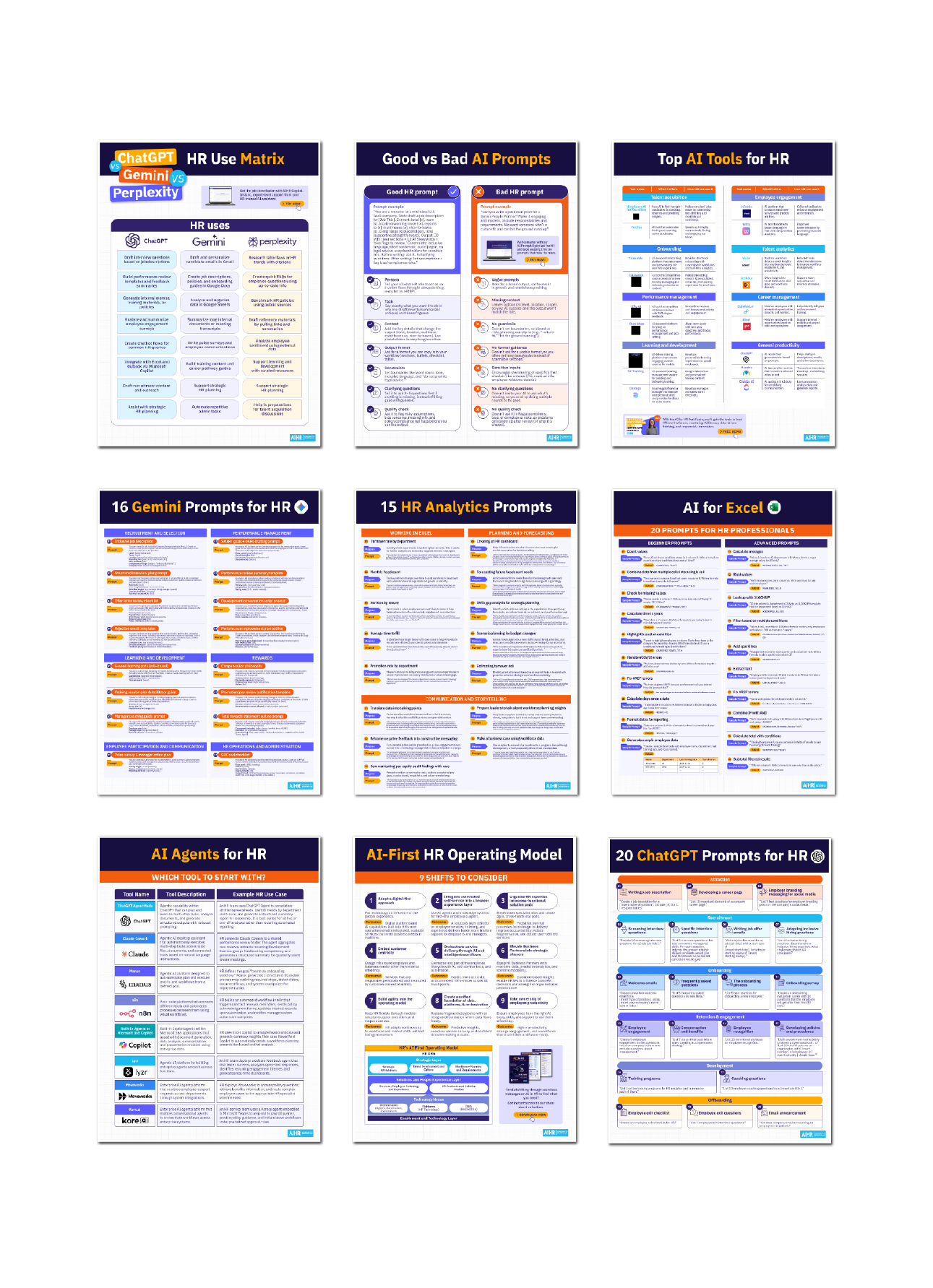 Download the collection to access 10 cheat sheets, 83+ AI prompts for HR, and guidance on choosing the right AI tools for different HR tasks