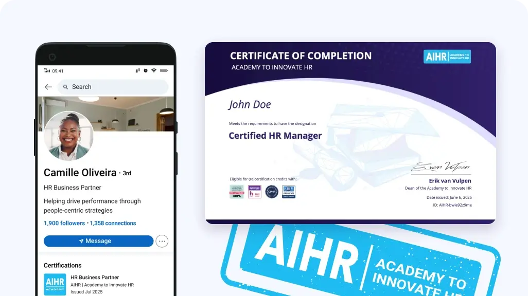 AIHR’s online HR courses and certification are eligible for professional development credits with the world’s leading HR institutes.